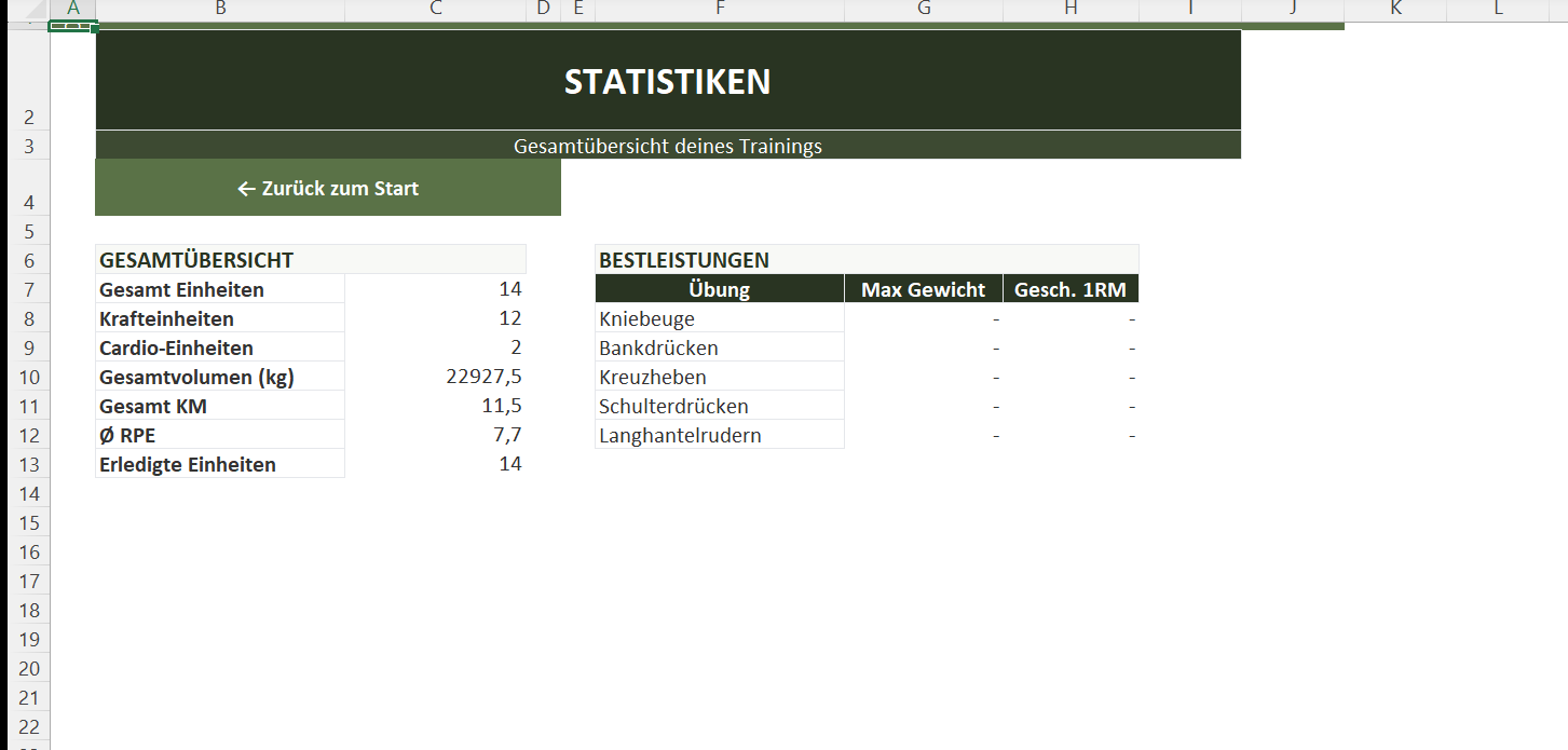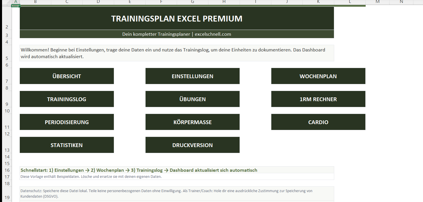 Willkommensseite mit KPI-Karten (Einheiten gesamt, Volumen, durchschn. RPE), Navigationsbuttons zu allen 12 Blättern und kurzer Anleitung.