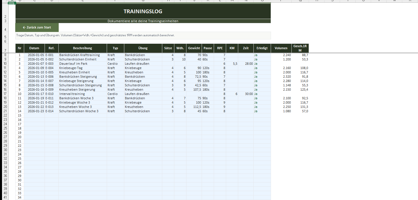 Du suchst einen Trainingsplan in Excel, der automatisch dein Volumen, 1RM und deinen Fortschritt erfasst? Diese Vorlage gibt dir einen kompletten Überblick über dein Training – ohne selbst Formeln erstellen zu müssen.