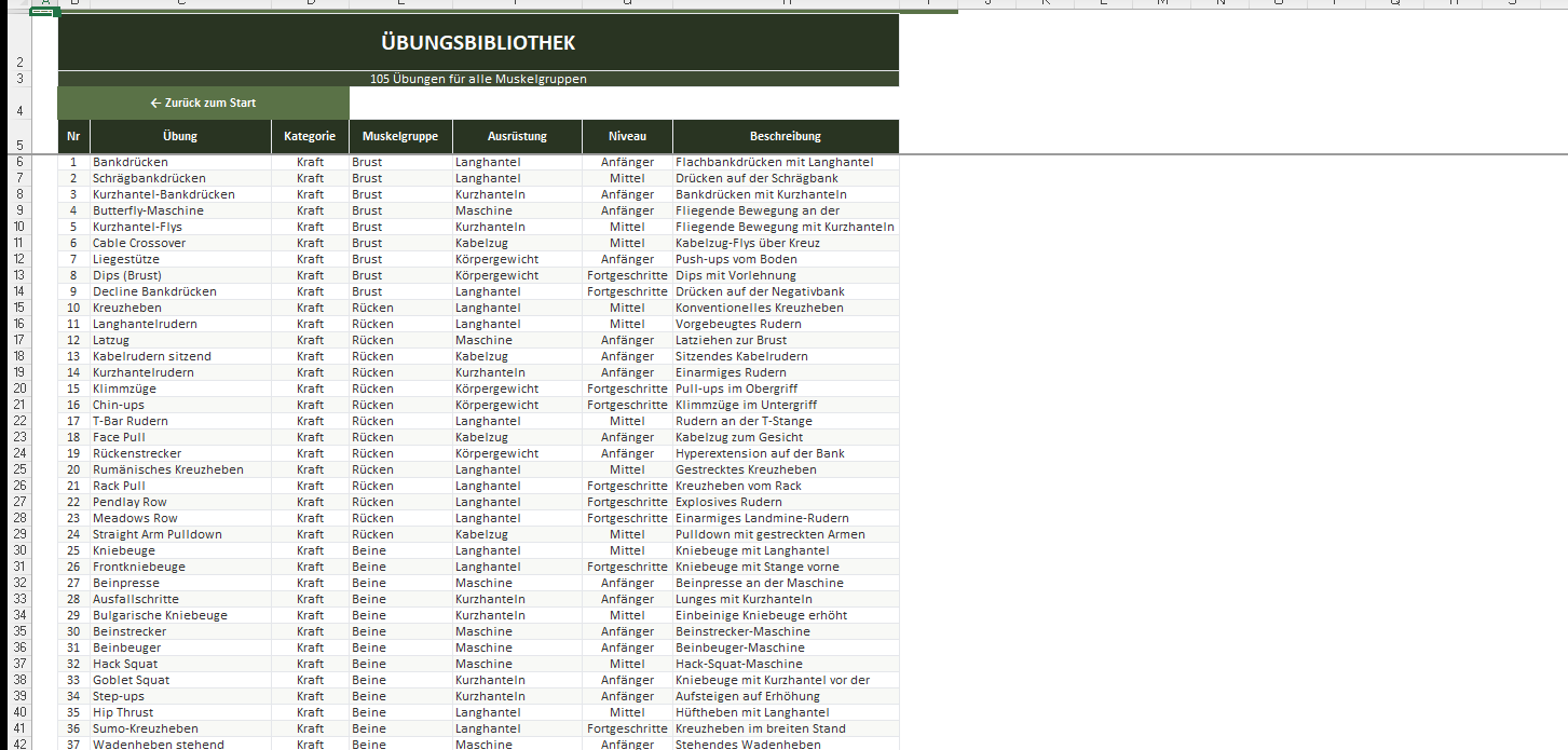 105 vorausgefüllte Übungen mit Kategorie, Muskelgruppe und Typ. Plus 20 leere Zeilen für eigene Übungen.