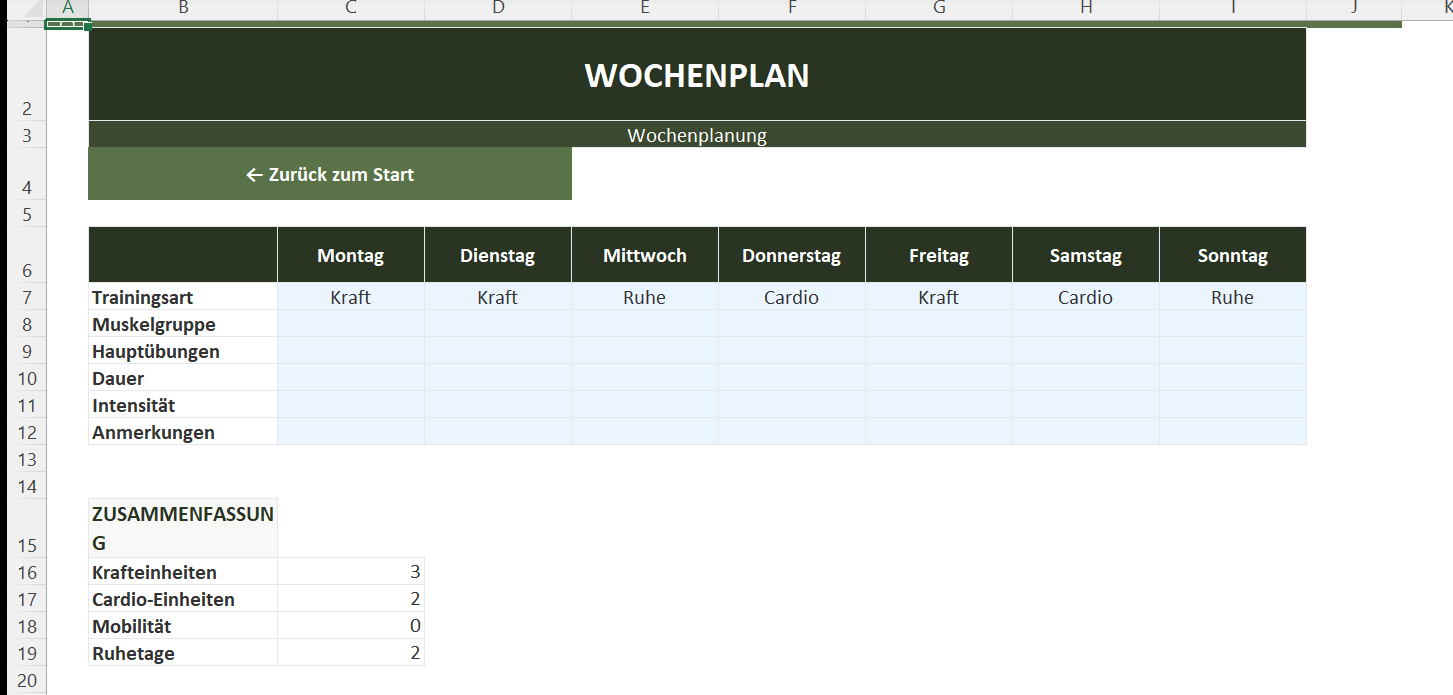 Plane deine Woche mit Trainingstyp pro Tag (Kraft, Cardio, Mobilität, Ruhetag). Automatische Zählung der Einheiten pro Typ.